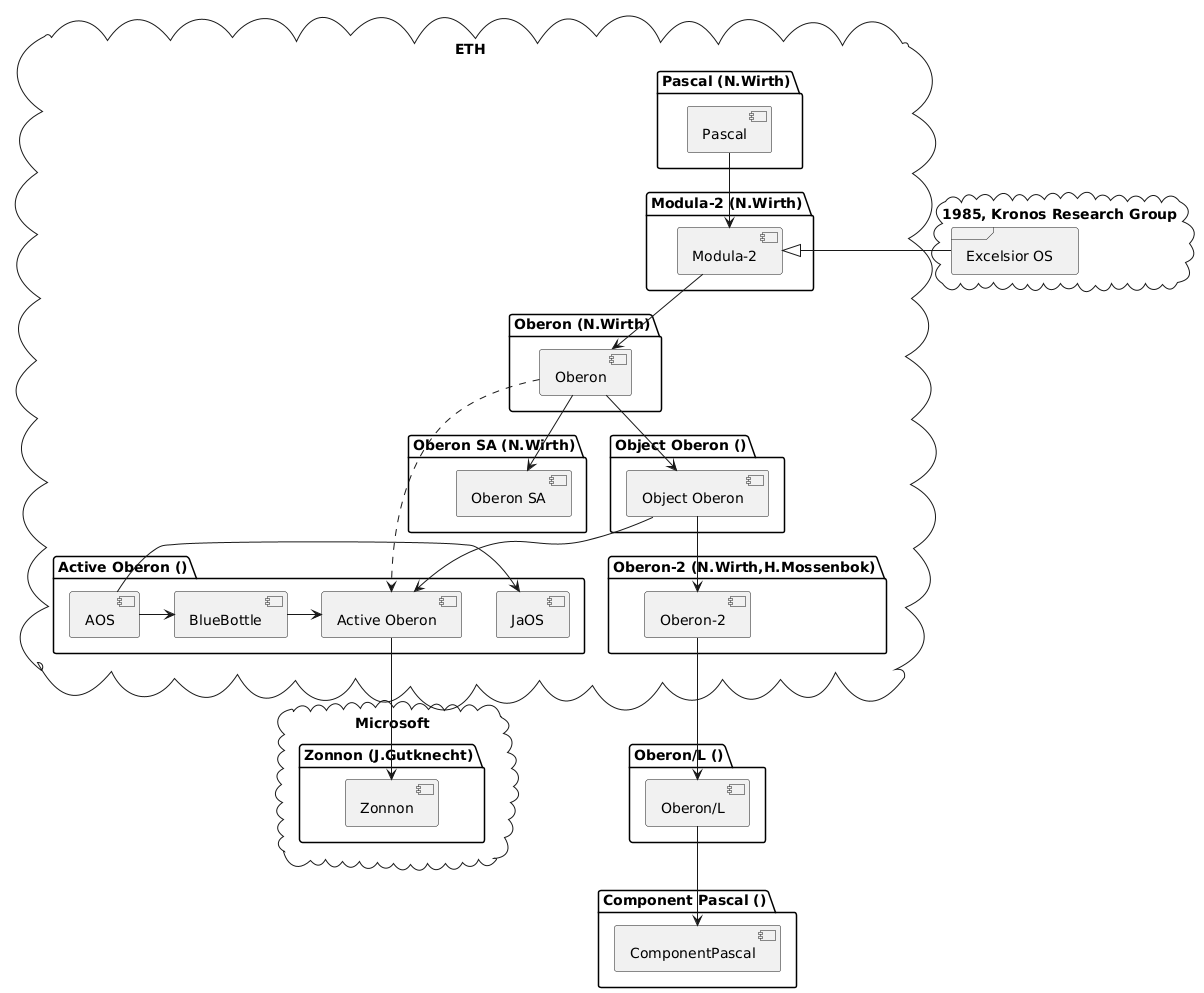 ETHPascal (N.Wirth)Modula-2 (N.Wirth)Oberon (N.Wirth)Oberon SA (N.Wirth)Object Oberon ()Oberon-2 (N.Wirth,H.Mossenbok)Active Oberon ()MicrosoftZonnon (J.Gutknecht)Oberon/L ()Component Pascal ()1985, Kronos Research GroupPascalModula-2OberonOberon SAObject OberonOberon-2AOSJaOSBlueBottleActive OberonZonnonOberon/LComponentPascalExcelsior OS