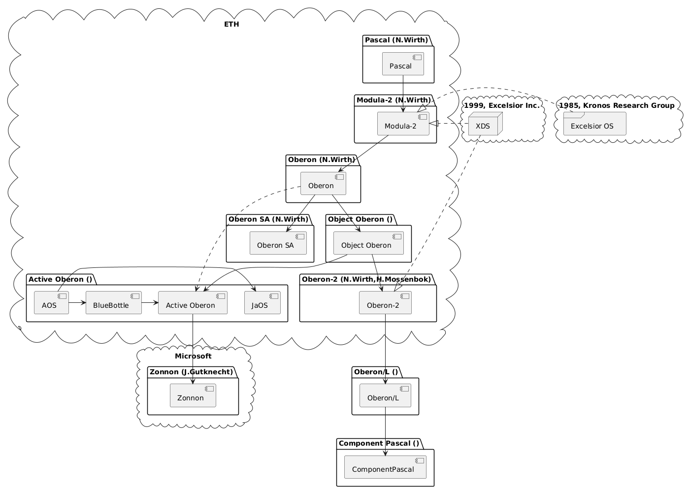 ETHPascal (N.Wirth)Modula-2 (N.Wirth)Oberon (N.Wirth)Oberon SA (N.Wirth)Object Oberon ()Oberon-2 (N.Wirth,H.Mossenbok)Active Oberon ()MicrosoftZonnon (J.Gutknecht)Oberon/L ()Component Pascal ()1985, Kronos Research Group1999, Excelsior Inc.PascalModula-2OberonOberon SAObject OberonOberon-2AOSJaOSBlueBottleActive OberonZonnonOberon/LComponentPascalExcelsior OSXDS