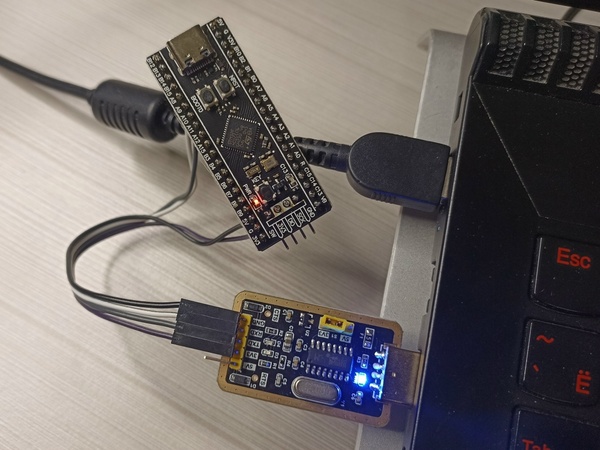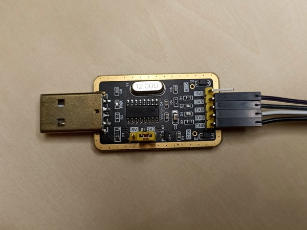 Для соединения платы микроконтроллера с ПК в подавляющем большинстве радиолюбительских или мелкосерийных проектов применяется USB-UART преобразователь. Наиболее распространённые модели используют различные варианты микросхемы CH340. Одна сторона такого устройства вставляется в USB-порт компьютера, а с другой стороны находятся несколько контактов, которые мы подключим к плате с микроконтроллером.