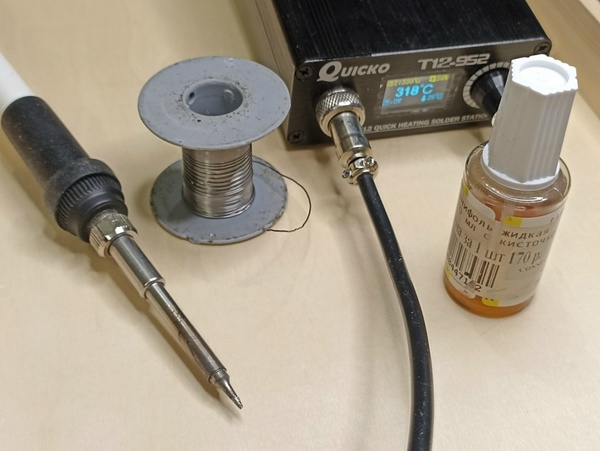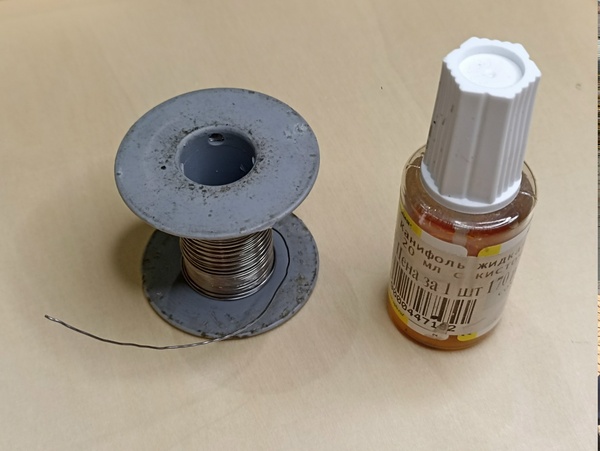 Для пайки нам понадобится припой и жидкая канифоль без кислоты (кислота со временем может привести к порче соединений, если не отмывать устройство в соде). Припой лучше использовать в виде проволоки 0,6-0,8 мм в диаметре. Такой припой в виде тонкой проволоки удобно подавать в прогретое место пайки.