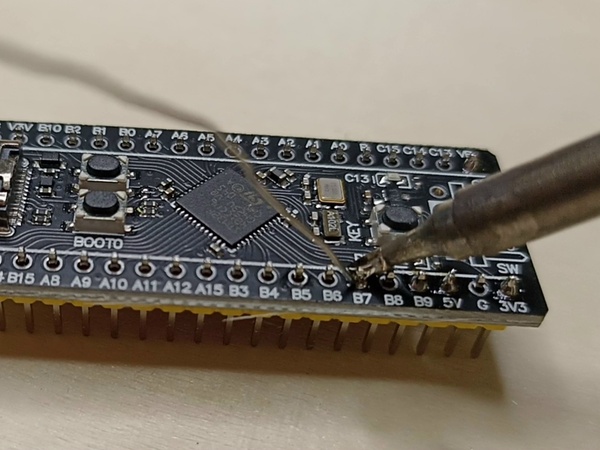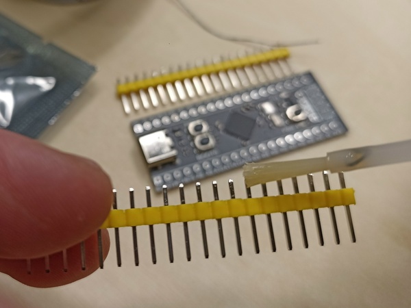 Поставим ровно плату на оба разъема, и прихватим крайние точки, чтобы разъемы были ориентированы строго перпендикулярно плоскости платы. Это важно, чтобы потом можно было с меньшим трудом вставить плату с микроконтроллером в макетную плату.
