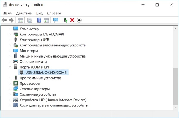 Если компьютер корректно видит USB-UART переходник, то в диспетчере устройств ОС Windows мы увидим новый COM-порт.